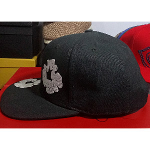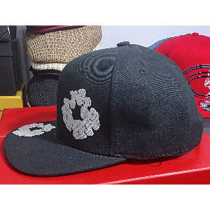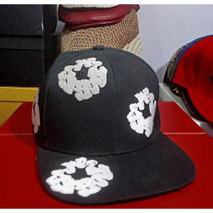 A stylish black hat with a unique white patch, featuring amebic white patches